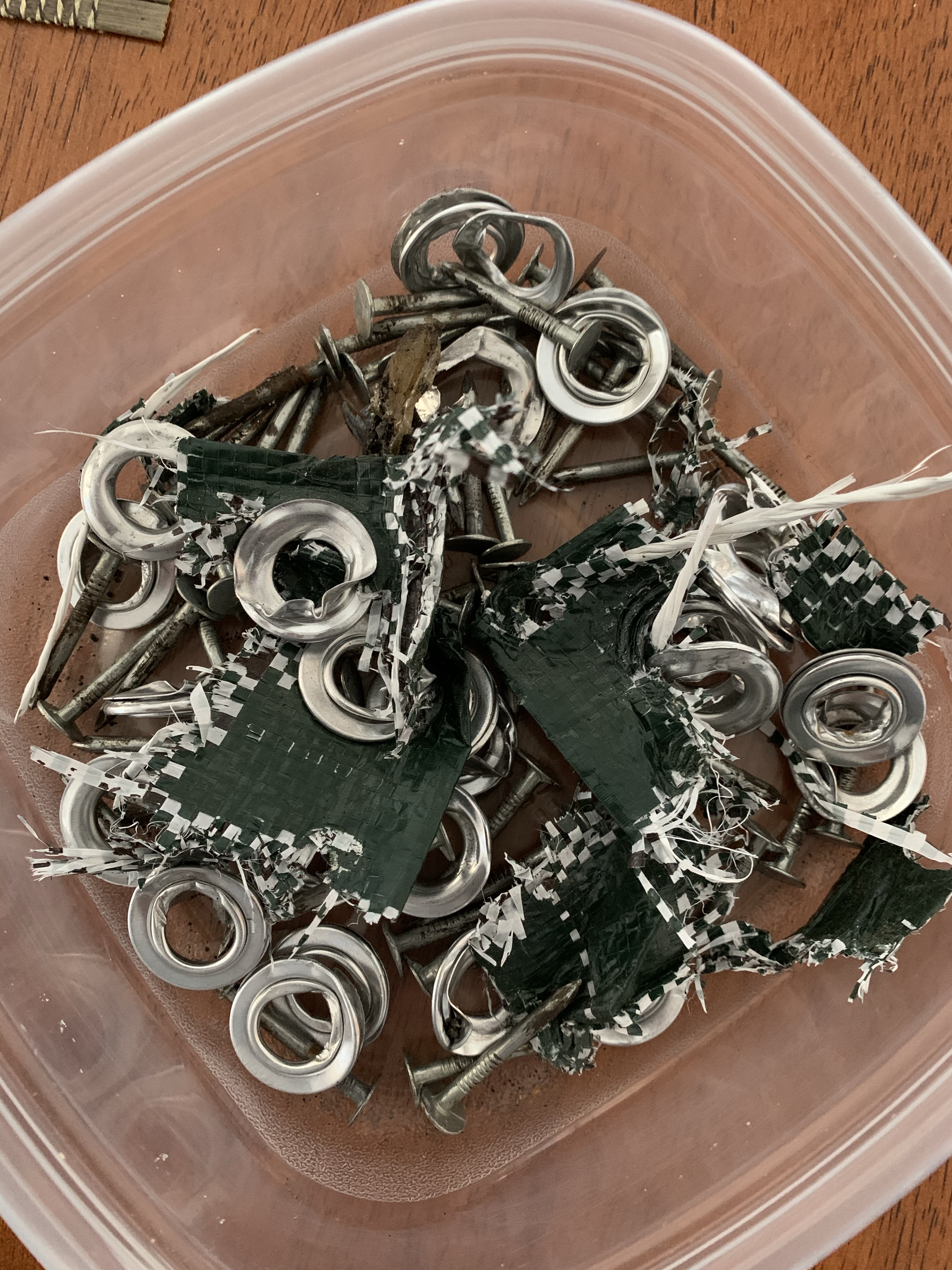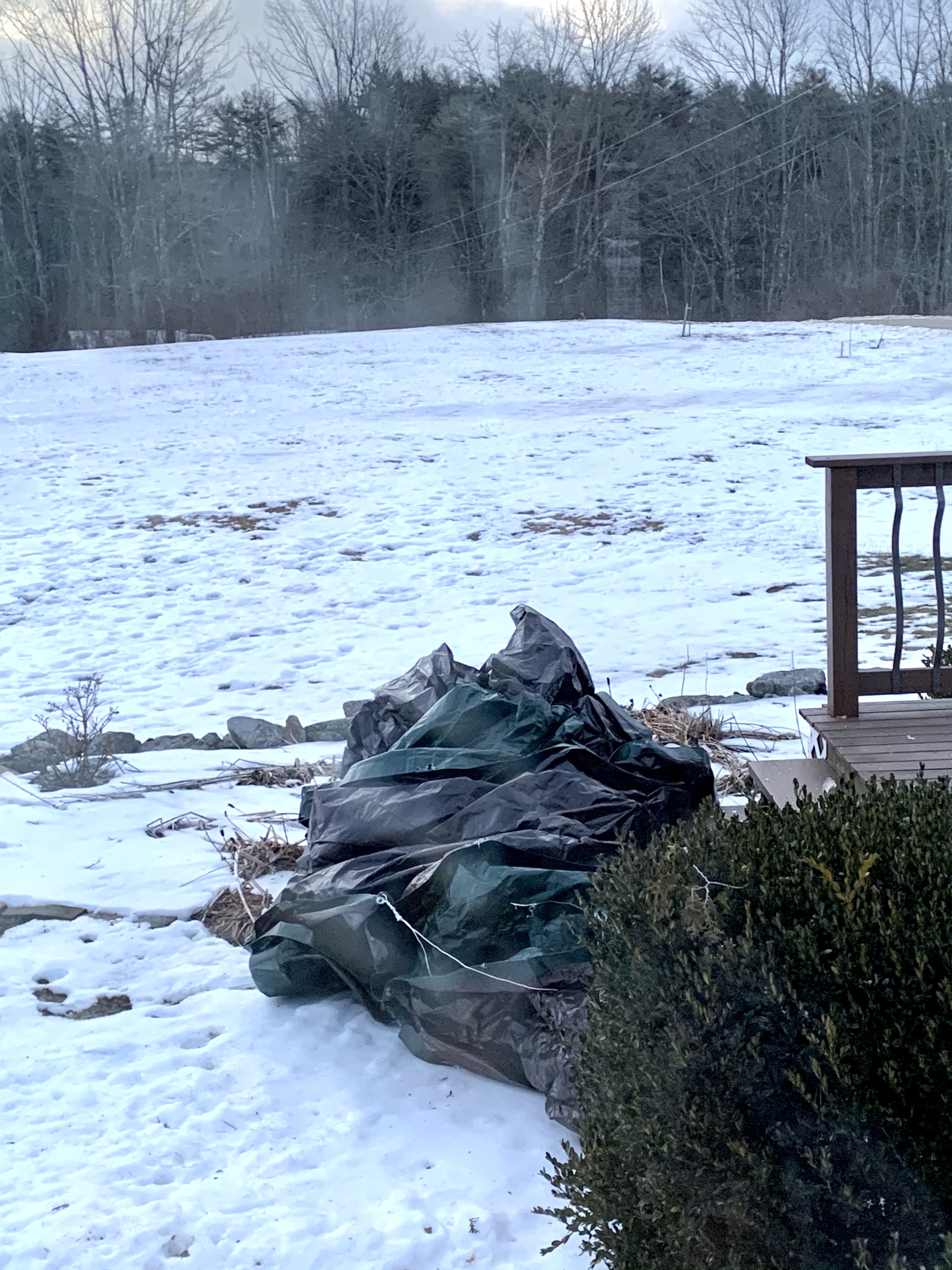 And lay a giant ass tarp. ( We’ll be the envy of all our neighbors now, so stylish! ) Then if you’re my husband, you leave a large part of it flapping in the corner.