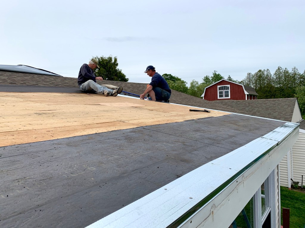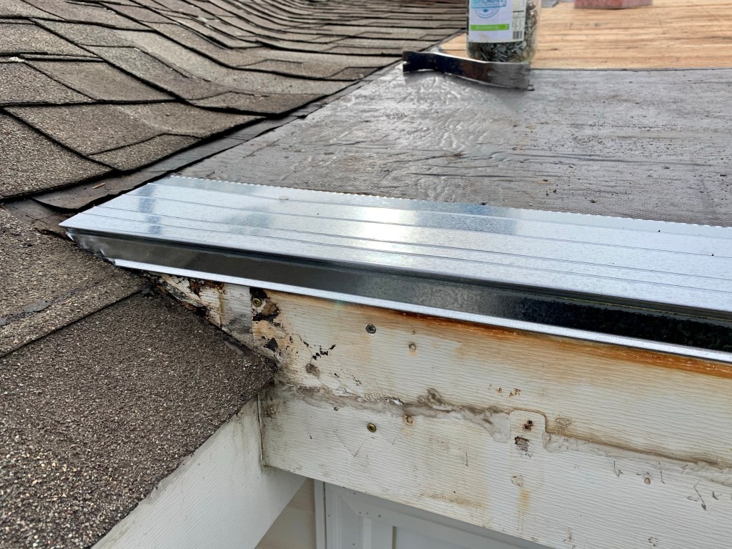 Roof section stripped, ice and water shield in place, drip edge nailed down.