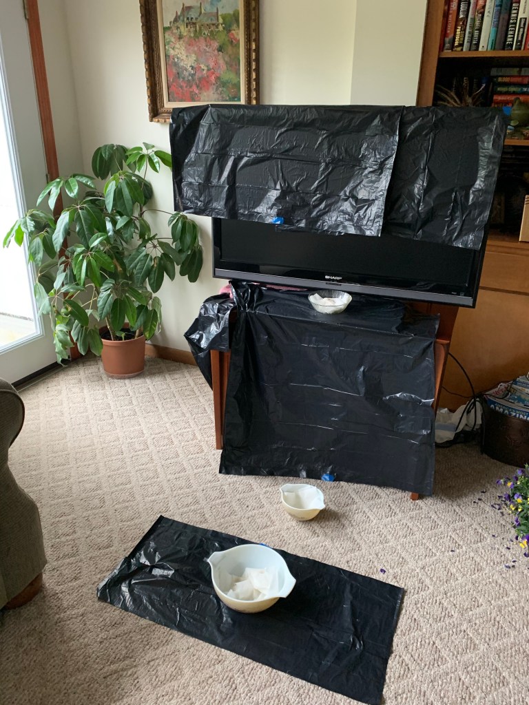He lost. ( Unplug the tv and move the table? Why… when you can just cover it with trash bags? It’s times like these I question my love for that man.)