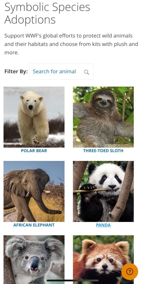 The World Wildlife Fund is currently running a fundraiser in which you “adopt” an animal. I think you receive a stuffed version and some other cutesy little stuff but that’s not what I’m blogging about.