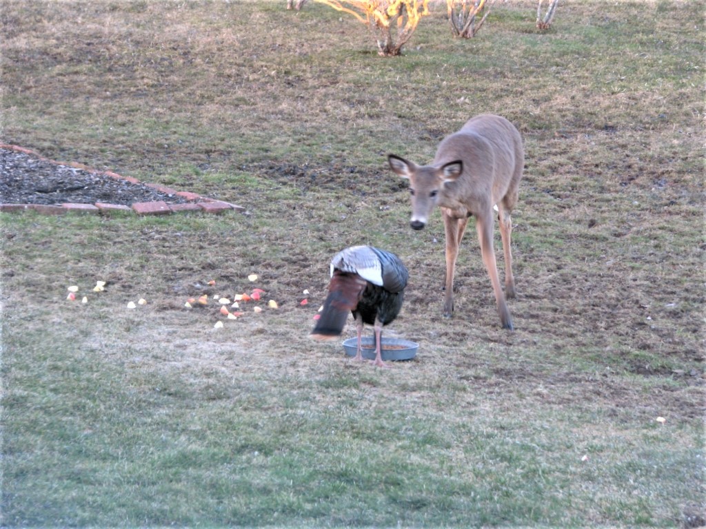 The next two pictures aren’t the best quality…blame my zoom lens and our resident buck’s propensity for showing up at dusk…. but I thought someone might be interested to see the antler shedding process.