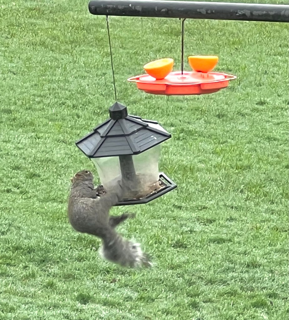 Now that the apple tree (I didn’t plant but grows better than those I do) is spreading it’s branches we have more squirrels coming to visit our feeders.