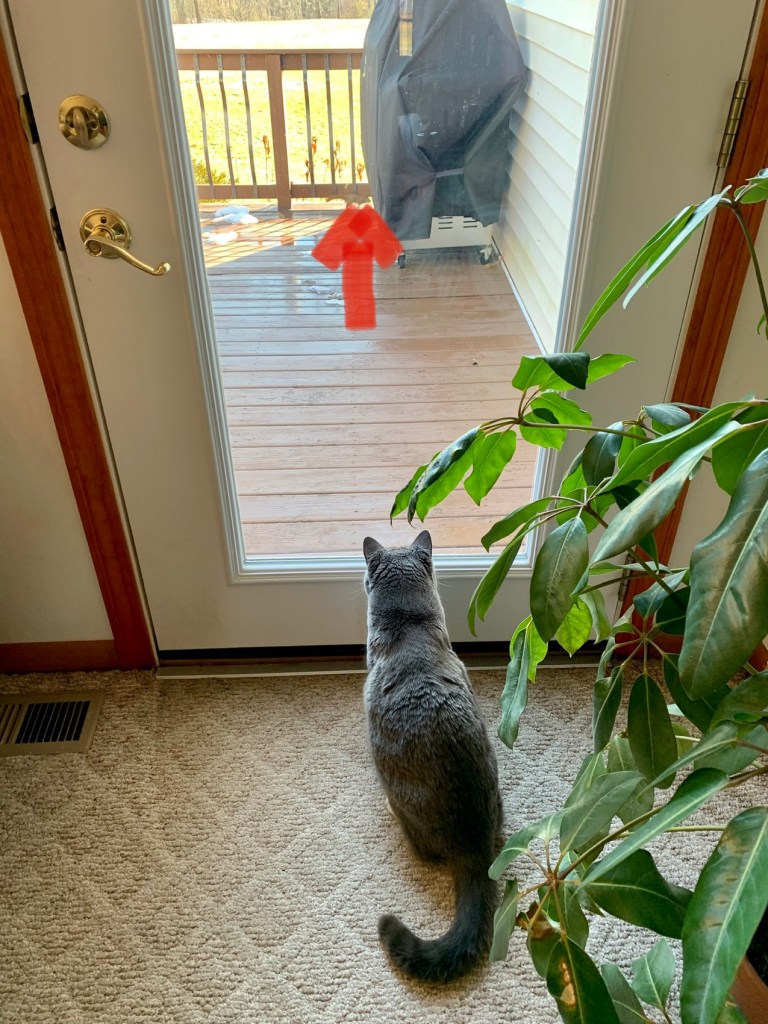 This little guy was sitting straight up… on a bent branch of our crabapple tree… in high wind.