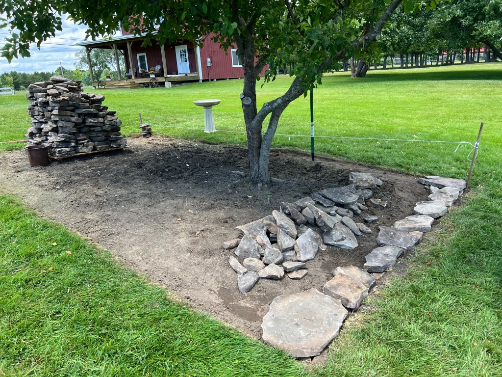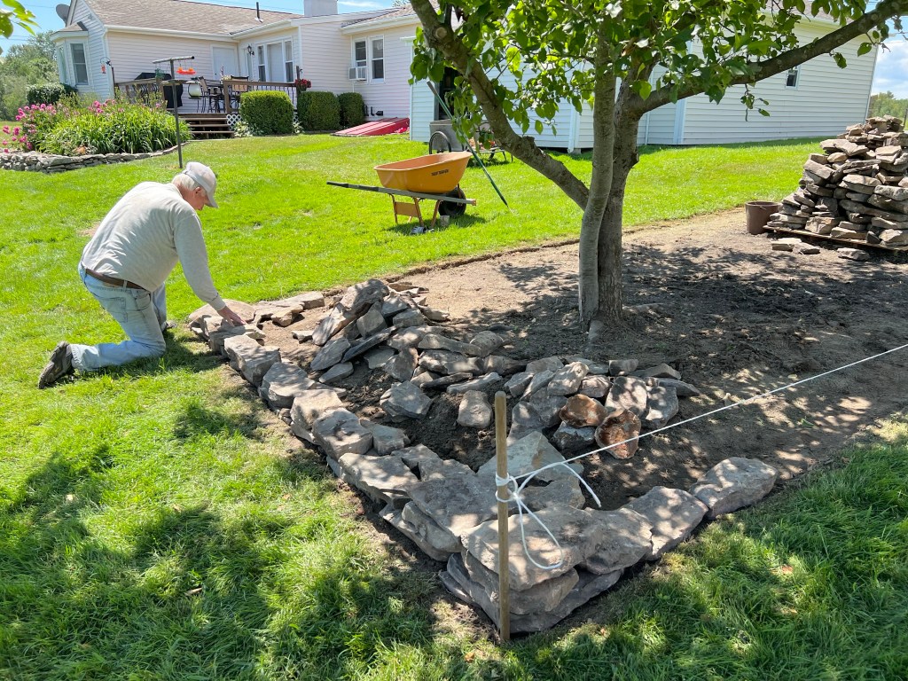 He heatedly explained the stone needed to be laid on flat earth and if I wanted him to do it, they would be laid inside the bed border. Period. End of discussion. Numerous hours of anger to follow.