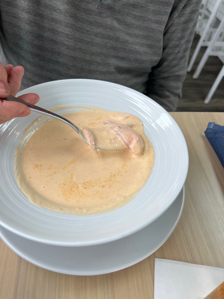 My husband’s lobster bisque, while creamy… wasn’t exactly brimming with lobster.
