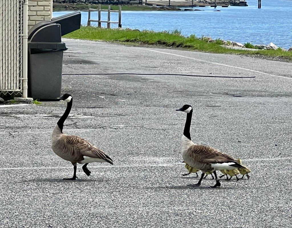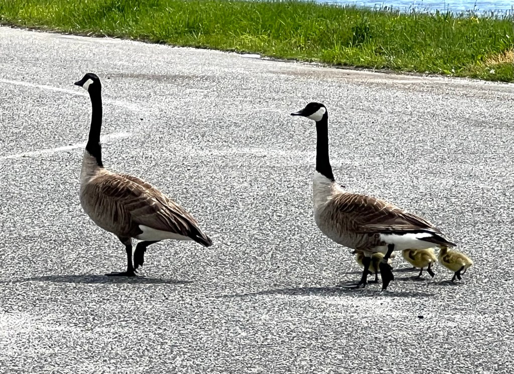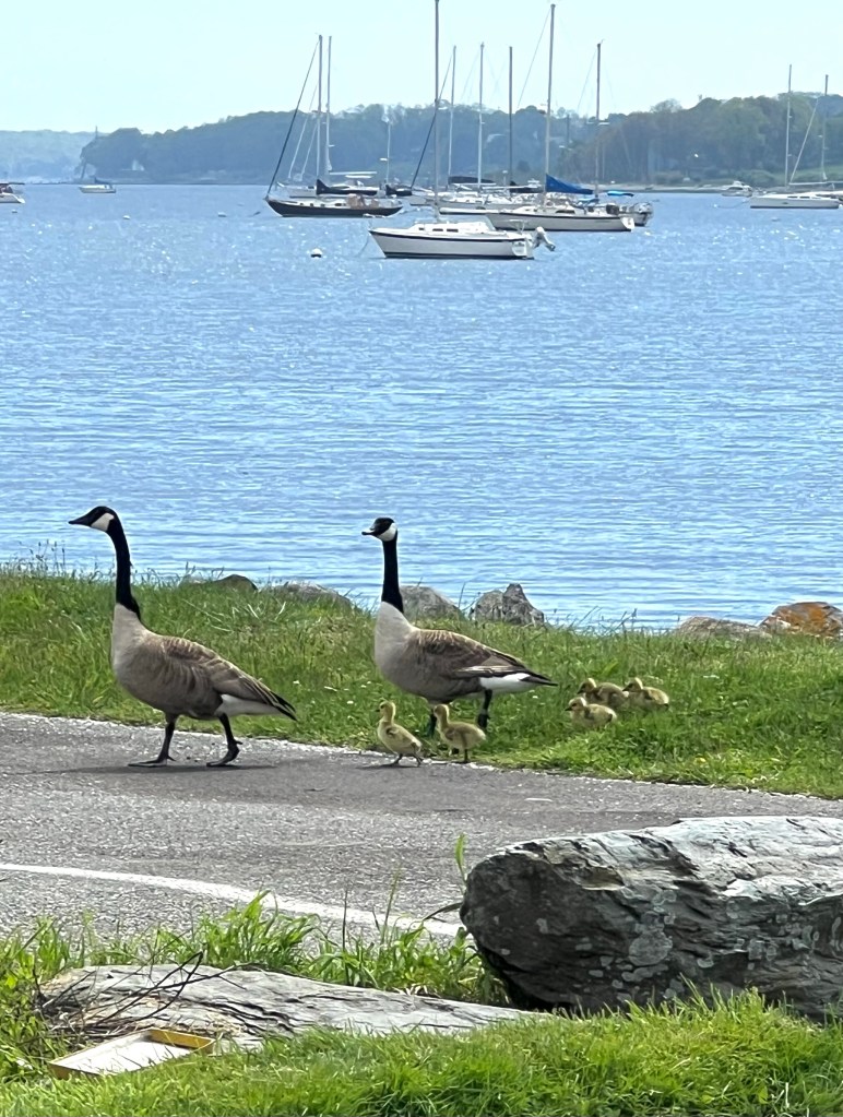 Which is when my husband jogged across, picked up every little gosling and plopped them over the side with mom and dad. Look to his right and you’ll see an adult goose head giving him the stink eye.