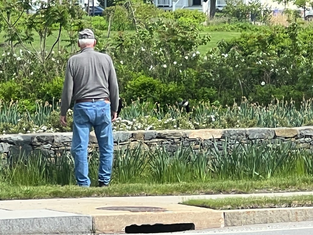 Once they were safely across, the mother and father geese jumped a stone wall to access a pond, but the goslings couldn’t manage the leap and were distressed enough to start heading back to the road…