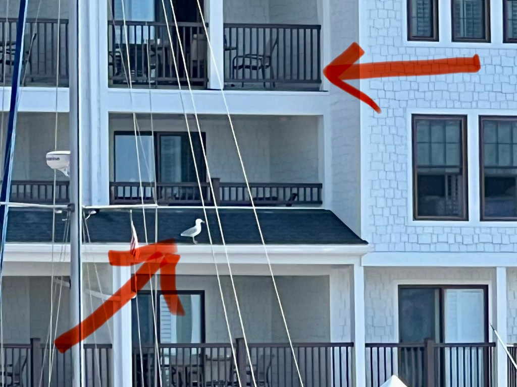 Bottom arrow is our hungry seagull. Clearly waiting for us to return with a snack.