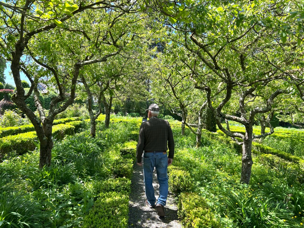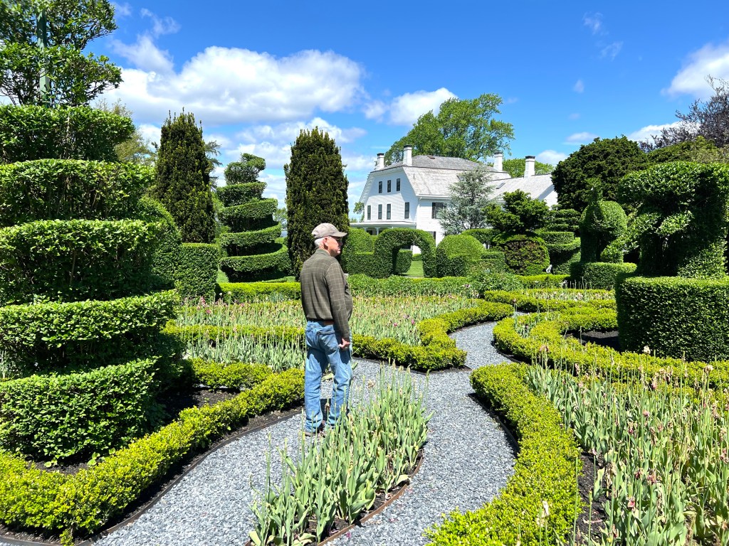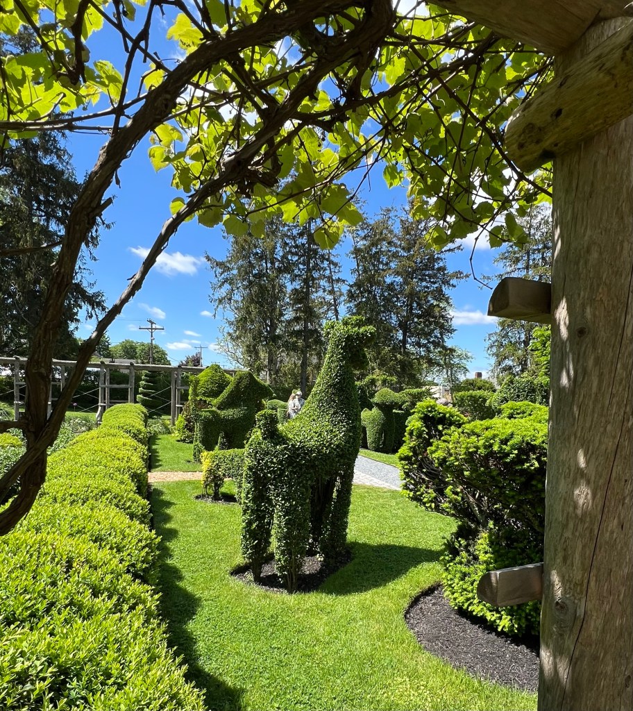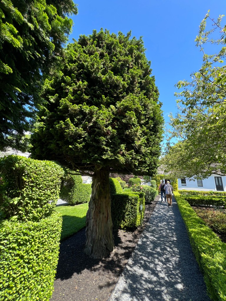 She lives right up the road and walks down to the gardens every day to help the docents …. as well as socialize. She told us she was quite unhappy with the current crew of topiary trimmers. The policeman was too fat, the giraffe was too short and the goose looked like a duck.