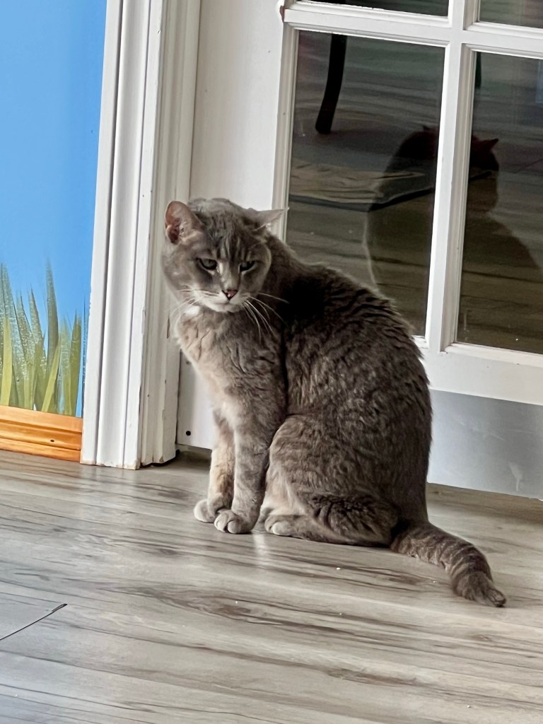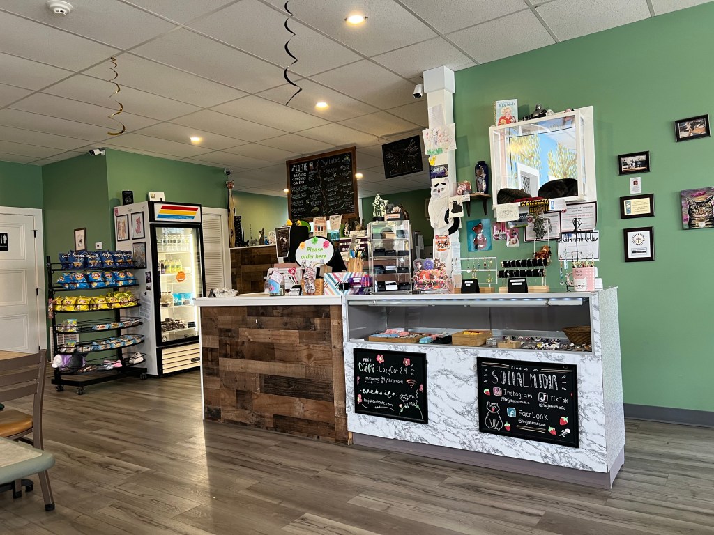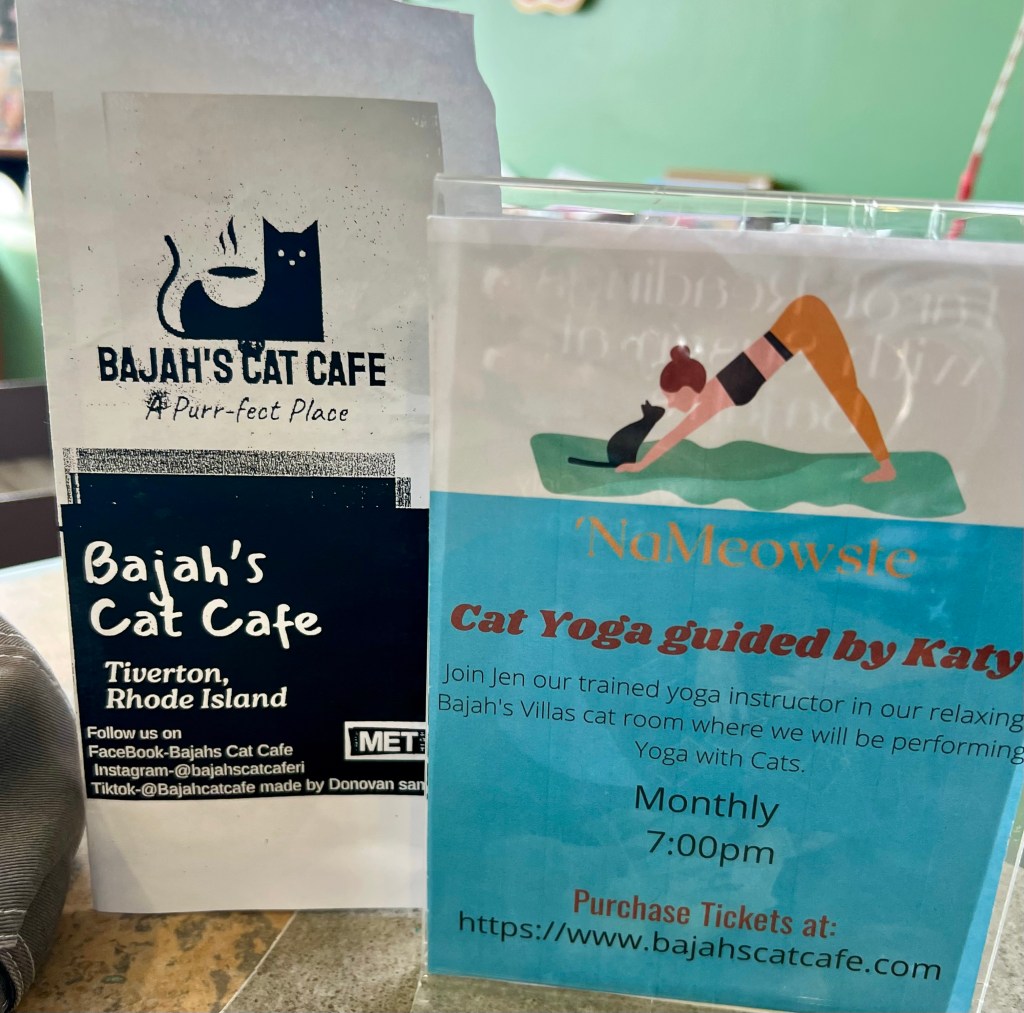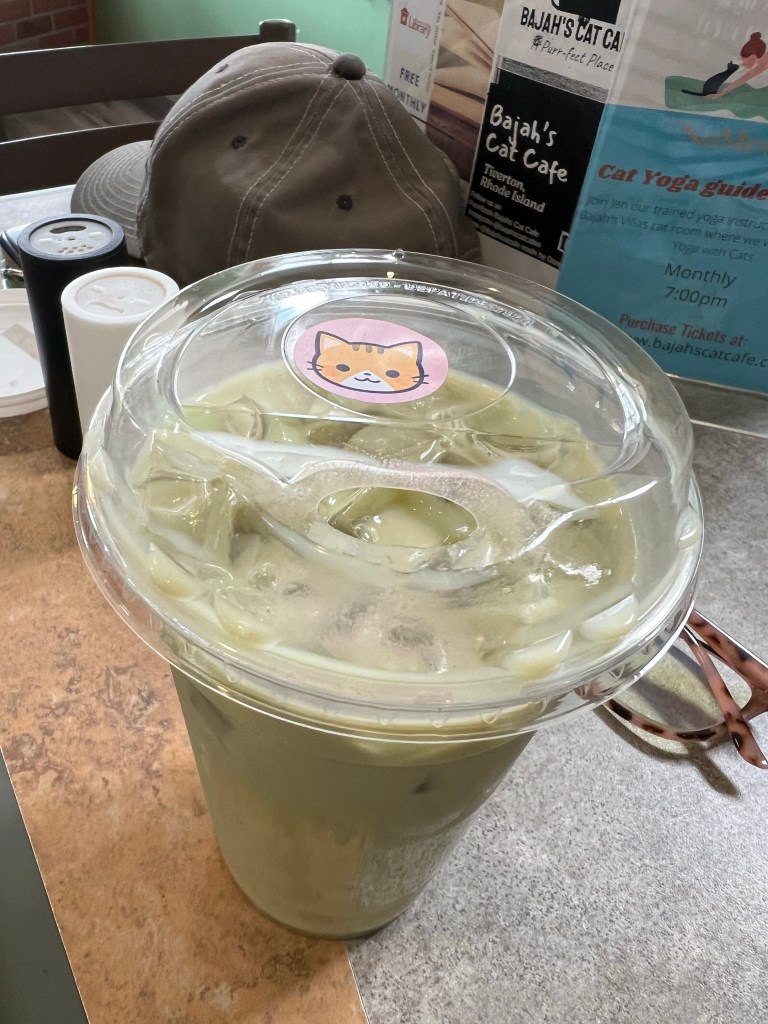 Turns out my dream of leisurely sipping and petting was ill formed as the actual cats are not allowed anywhere near the food and beverages. They’re in a separate room, which because we always have bad timing… was hosting a book club that wouldn’t be done for another half an hour.