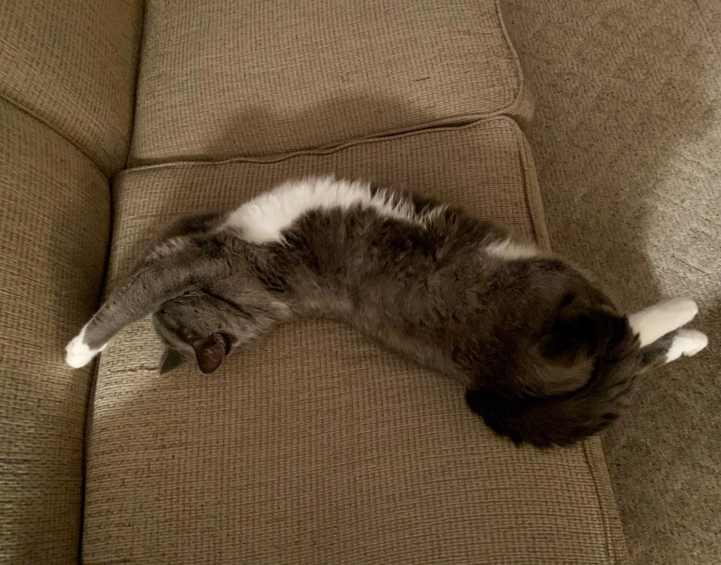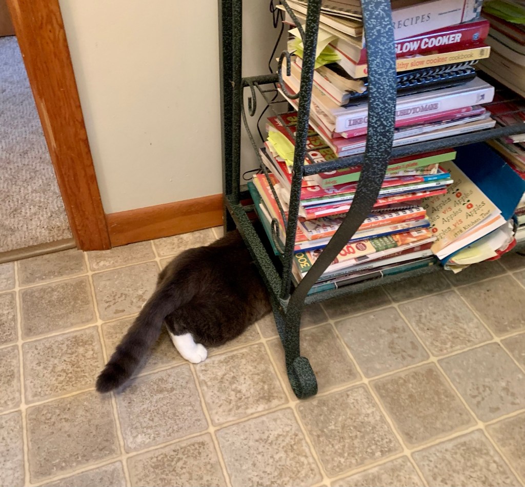 And like the rest of us, Lord Dudley Mountcatten has put on a few extra Covid pounds. He used to be able to slink under this shelf, now he just gets stuck half way in.