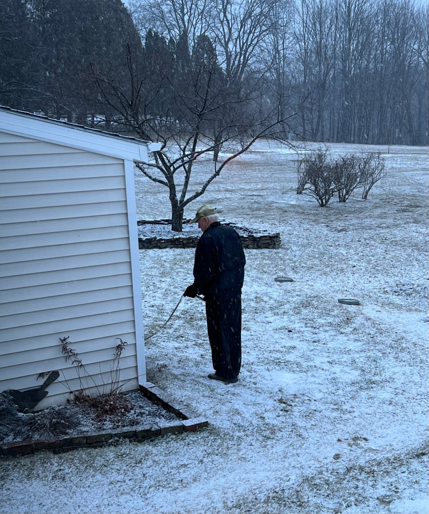 Which is why he hightailed it to the shelter of the woodshed and left the husband out in the storm. Cats are a lot of things, but stupid isn’t one of them.