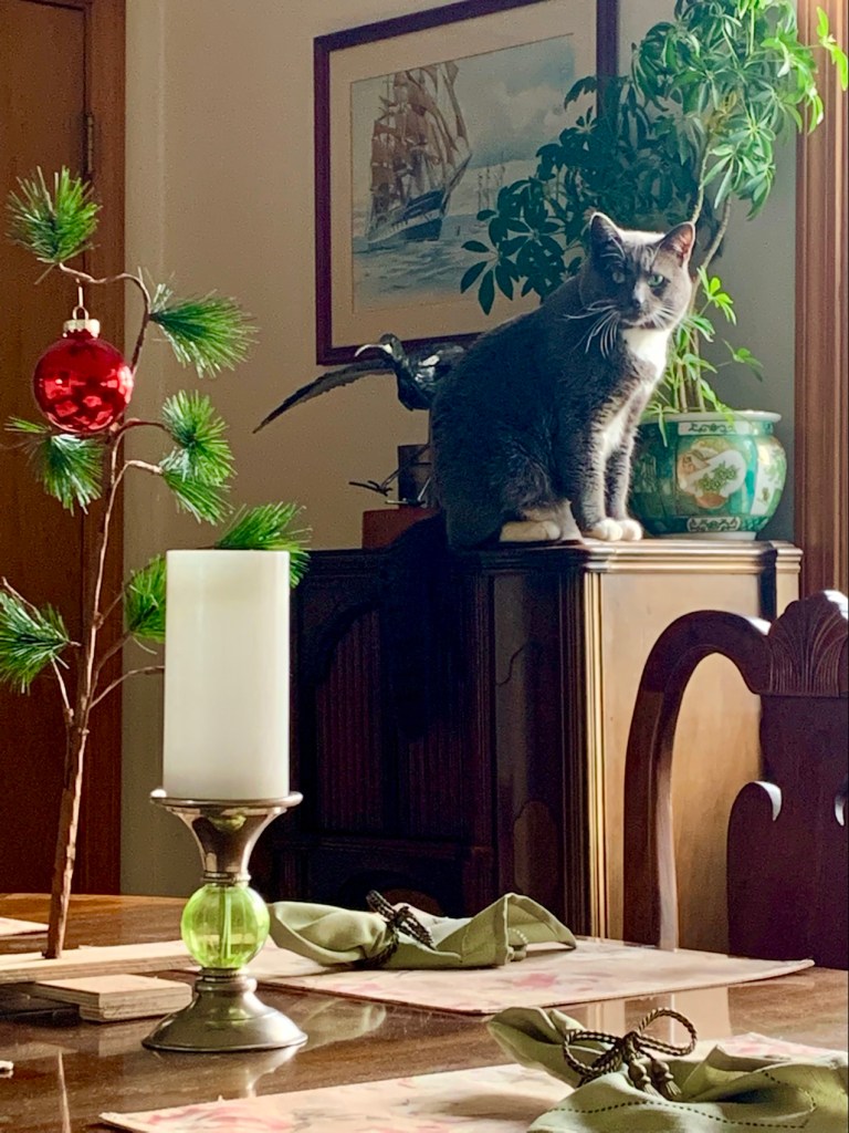 And while he’s allowed on the couches, chairs and beds … he’s not allowed on the tables, bureaus and desks. This ban also goes for the husband’s antique radio…